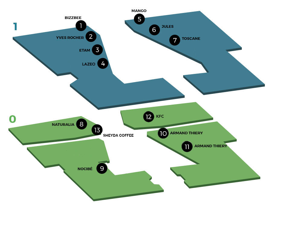 Vous trouverez ci dessous le plan de nos boutiques. Cliquez sur le logo de l'enseigne pour accéder aux informations spécifiques à celle-ci.